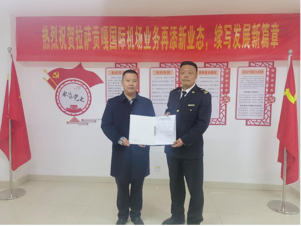 3日,拉薩海關(guān)負責人向西藏機場集團貨運部負責人頒發(fā)海關(guān)監(jiān)管貨物倉儲企業(yè)注冊登記證書。(拉薩海關(guān)供圖)