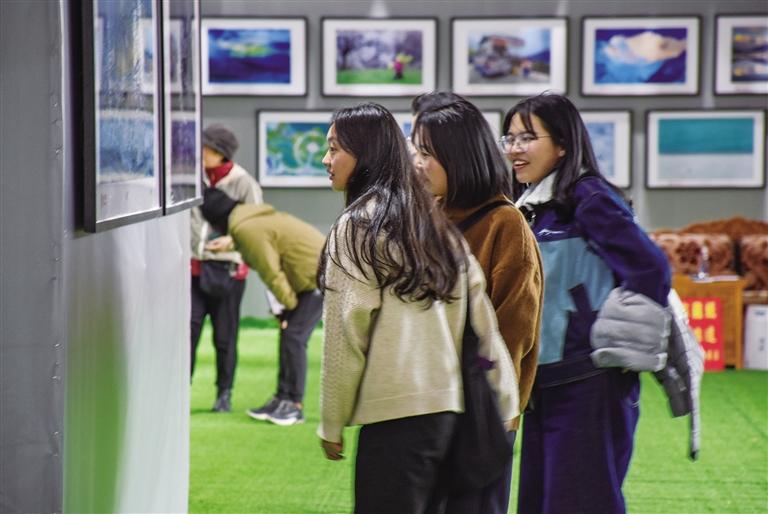 大學(xué)生在書畫展覽現(xiàn)場參觀。
