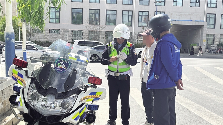 4月22日下午,記者來到拉薩市江蘇東路與嘎瑪貢桑路交叉路口,此時車來車往,道路交通十分繁忙,拉薩市公安局交警支隊的民警們正在路口疏導(dǎo)交通,并提醒過往電動車駕駛員佩戴好安全頭盔。行動中,一輛摩托車迎面而來,由于乘客未佩戴安全頭盔被執(zhí)勤民警攔下,民警耐心地講解了佩戴安全頭盔的重要性以及不佩戴安全頭盔可能帶來的危害,并依法對其進(jìn)行了處罰?!耙院篁T摩托車出行,我們一定會佩戴好安全頭盔,遵守交通規(guī)則,確保自身安全。”摩托車駕駛員李某說。
