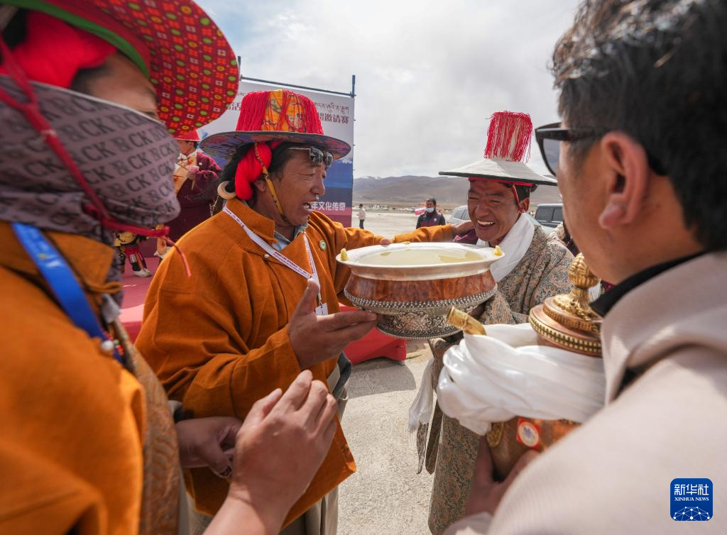 4月27日,獲獎馬匹的主人(右二)在喝青稞酒,接受祝福。新華社記者 晉美多吉 攝