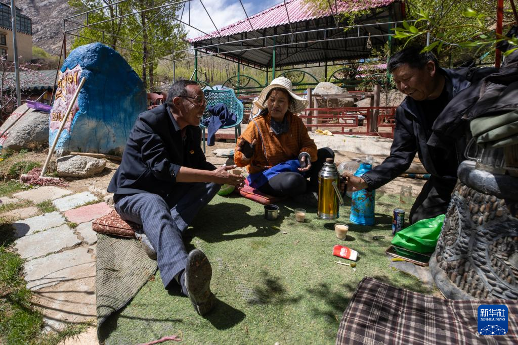 尼瑪(左一)在村里的一家農(nóng)家樂與經(jīng)營者交談(4月24日攝)。新華社記者 姜帆 攝