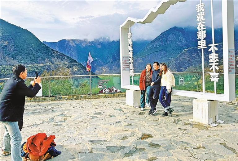 游客在雅魯藏布江大拐彎觀景臺(tái)拍照留念。記者 白瑪澤旺 攝