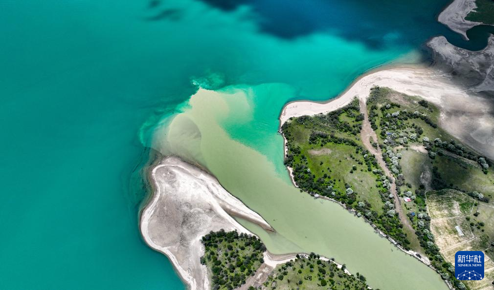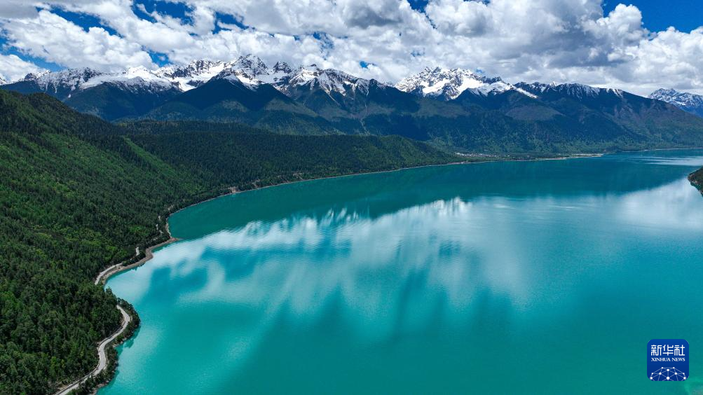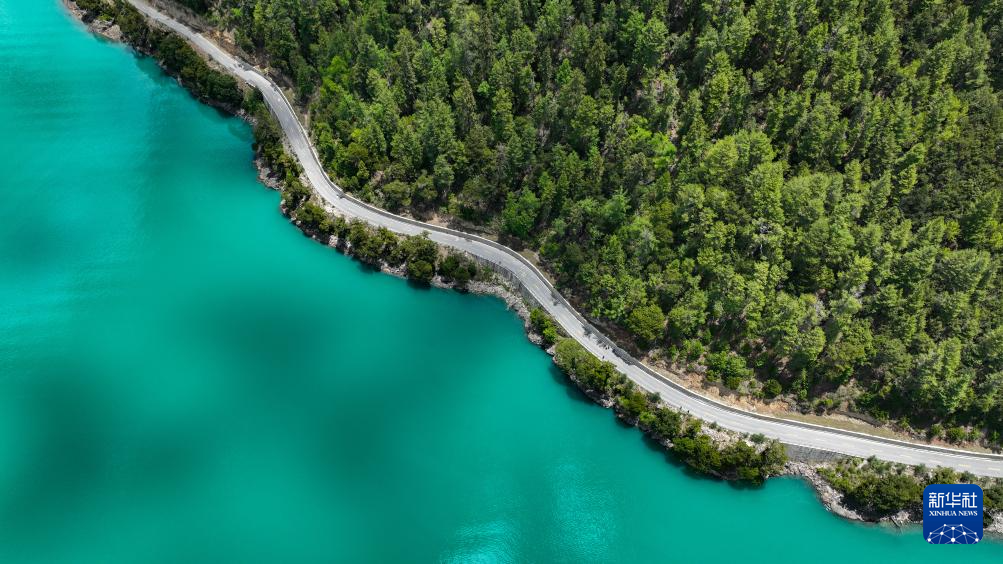 巴松措岸邊蜿蜒的公路(5月28日攝,無人機照片)。新華社記者 晉美多吉 攝