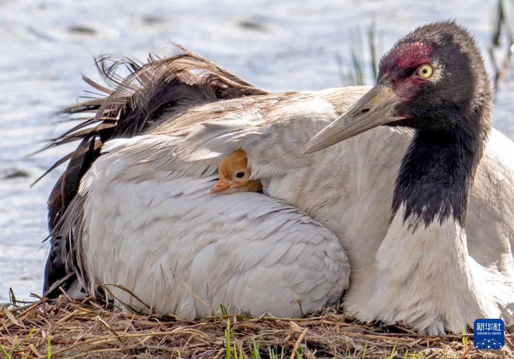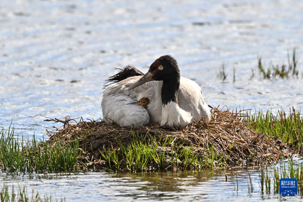 一對黑頸鶴在那曲市申扎縣的濕地上照顧剛出殼的雛鳥,一只將其護(hù)在身下保持溫暖,另一只則在旁保持警戒(6月4日攝)。新華社記者 姜帆 攝 ??
