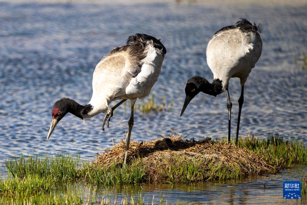 一對黑頸鶴在那曲市申扎縣的濕地上“換班”照顧剛出殼的雛鳥(6月4日攝)。新華社記者 姜帆 攝 ??