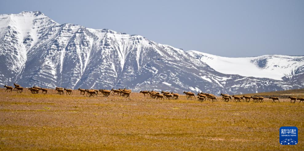一群雌性藏羚羊在羌塘國家級自然保護區(qū)核心區(qū)內(nèi)繁殖遷徙(6月8日攝)。新華社記者 劉金海 攝