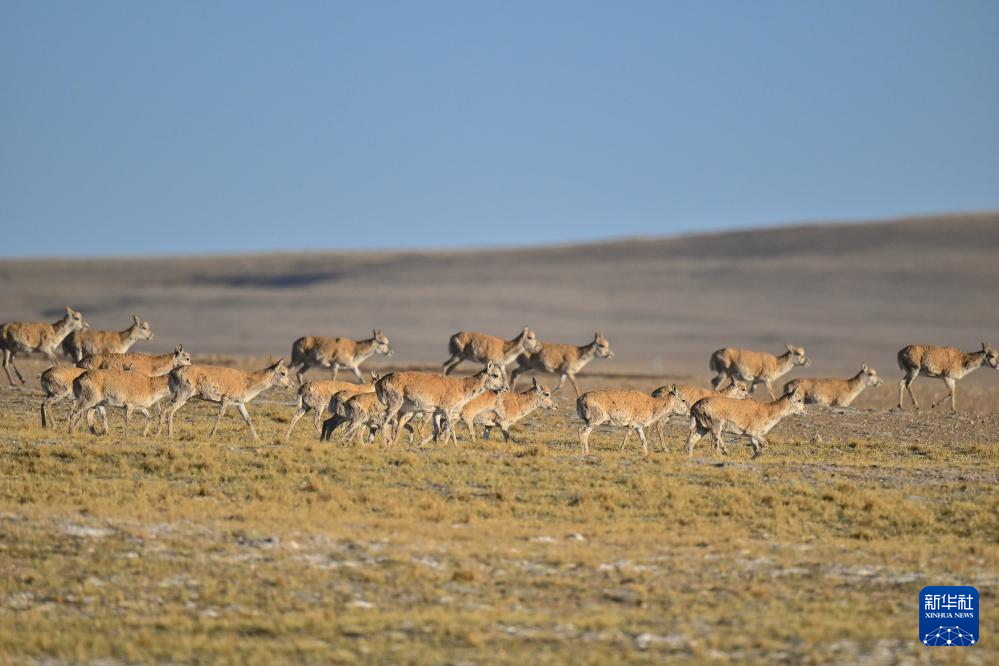 一群雌性藏羚羊在羌塘國家級自然保護區(qū)核心區(qū)內(nèi)進行繁殖遷徙(6月9日攝)。新華社記者 劉金海 攝 ??