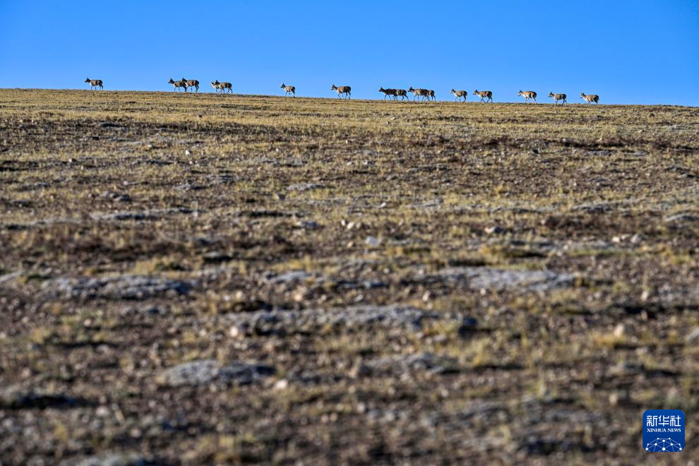 羌塘國家級自然保護區(qū)核心區(qū)繁殖遷徙路上的雌性藏羚羊群(6月10日攝)。新華社記者 姜帆 攝 ??