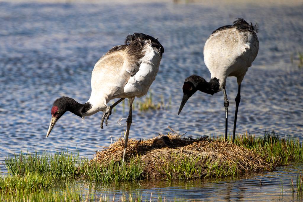 黑頸鶴在那曲市申扎縣申扎藏布濕地孵蛋(2024年6月7日攝)。新華社記者 姜帆 攝
