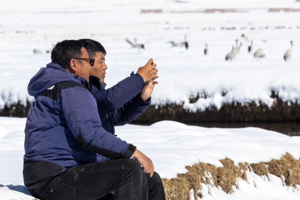 當(dāng)雄縣野生動(dòng)物疫源疫病監(jiān)測(cè)員尼瑪頓珠(左)和同事扎西頓珠在雪后的阿熱濕地觀察遷徙途中的黑頸鶴(2024年4月7日攝)。 新華社記者 姜帆 攝