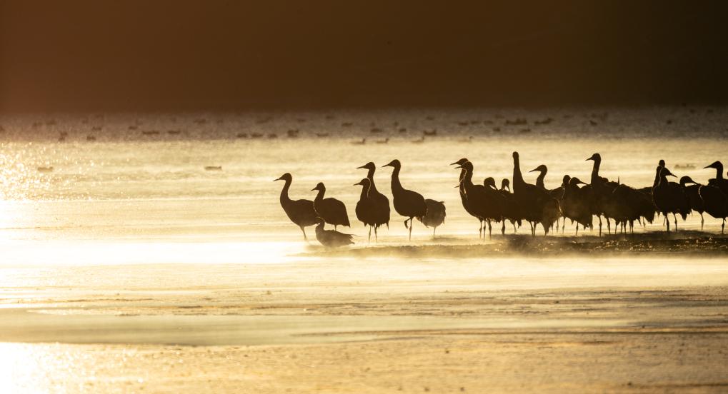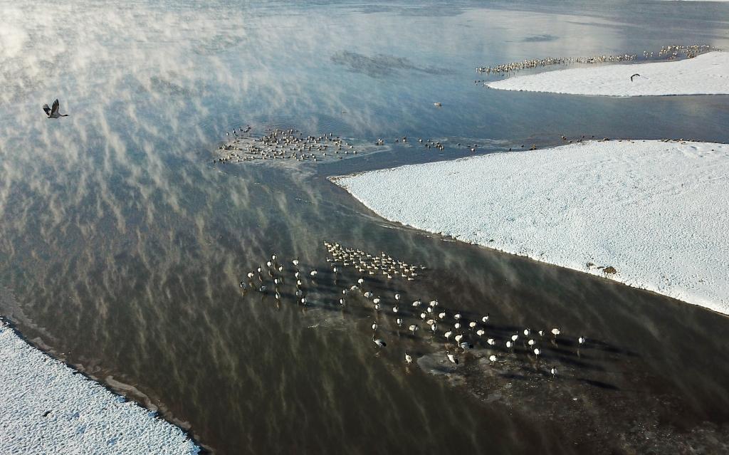 這是清晨在拉薩市林周縣虎頭山水庫(kù)拍攝的越冬黑頸鶴。西藏拉薩市林周縣位于拉薩河上游及澎波河流域,平均海拔約4200米,是黑頸鶴主要的越冬地之一(2023年12月5日攝)。新華社記者 姜帆 攝