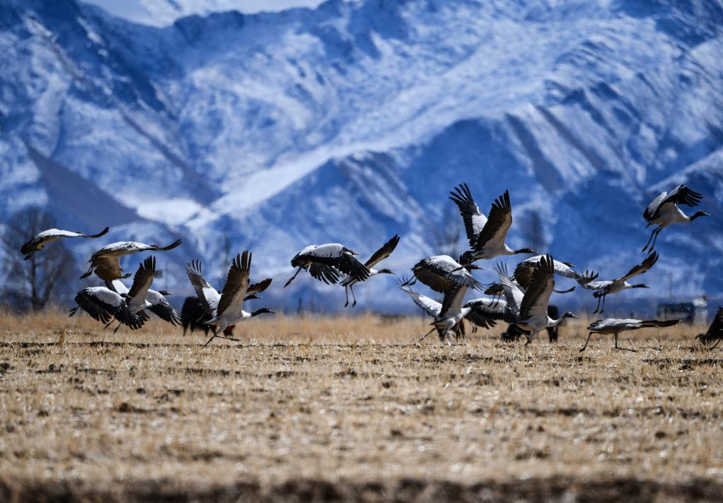 在拉薩市林周縣境內(nèi)越冬的黑頸鶴(2022年2月22日攝)。新華社記者 覺(jué)果 攝