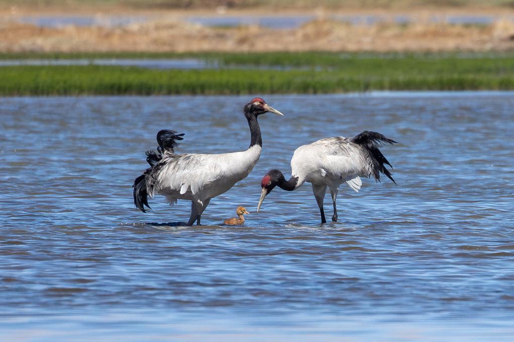一對(duì)黑頸鶴夫婦帶著雛鳥(niǎo)在西藏那曲市申扎縣一處濕地棲息、覓食(2024年6月9日攝)。新華社記者 旦增尼瑪曲珠 攝