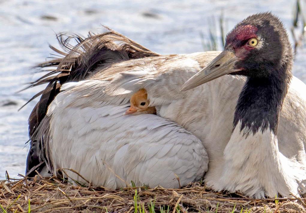 一只黑頸鶴在西藏那曲市申扎縣的申扎藏布濕地上照顧剛出殼的雛鳥(niǎo)(6月5日攝)。 新華社記者 姜帆 攝