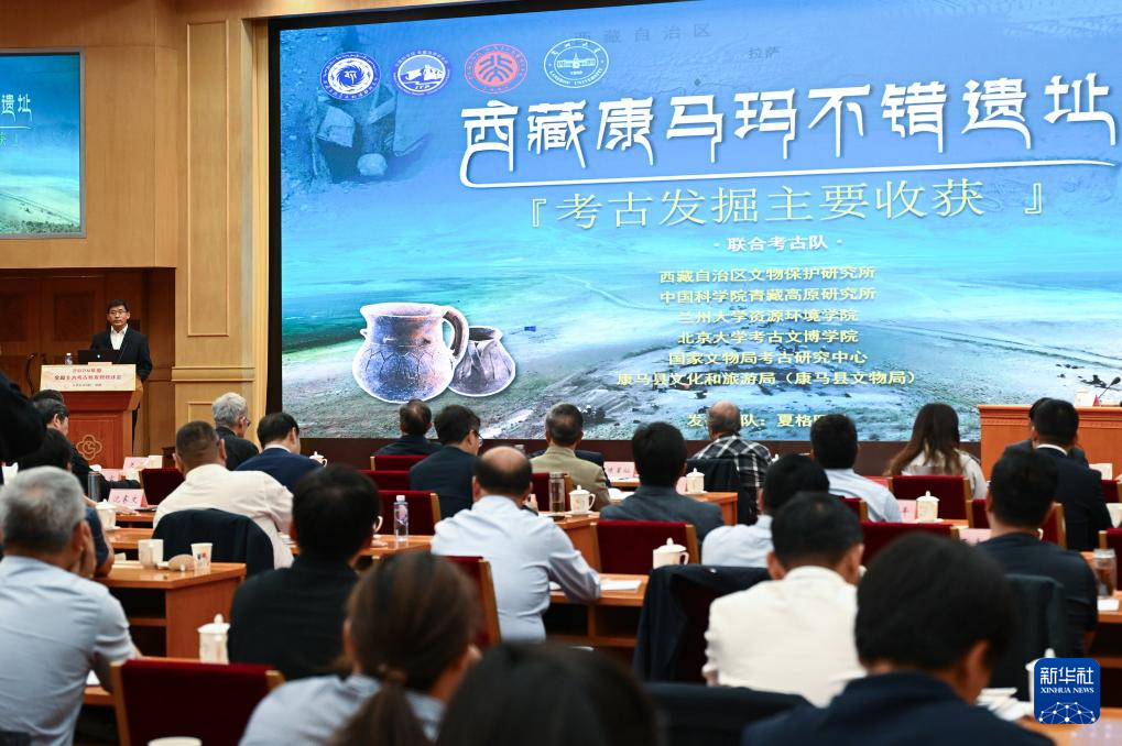 4月23日,聯(lián)合考古隊(duì)領(lǐng)隊(duì)夏格旺堆在“2024年度全國十大考古新發(fā)現(xiàn)”終評會現(xiàn)場向?qū)<覍W(xué)者和媒體介紹瑪不錯遺址相關(guān)情況。新華社記者 李賀 攝 ??