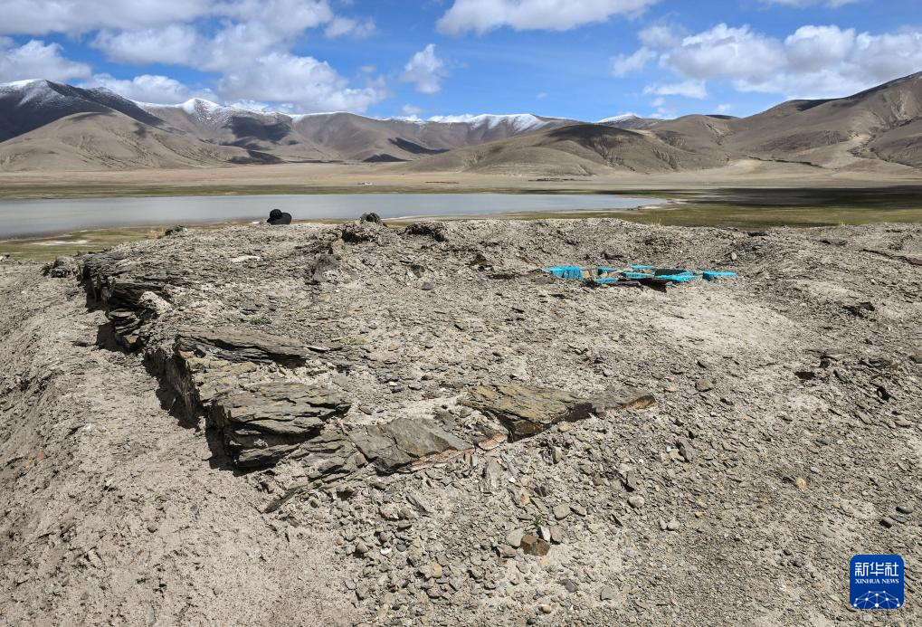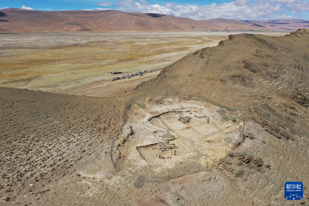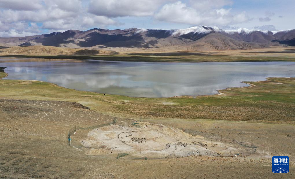 這是5月22日拍攝的坐落在瑪不錯湖畔的遺址第四期石構(gòu)地面建筑考古發(fā)掘現(xiàn)場(無人機(jī)照片)。新華社記者 李賀 攝 ??