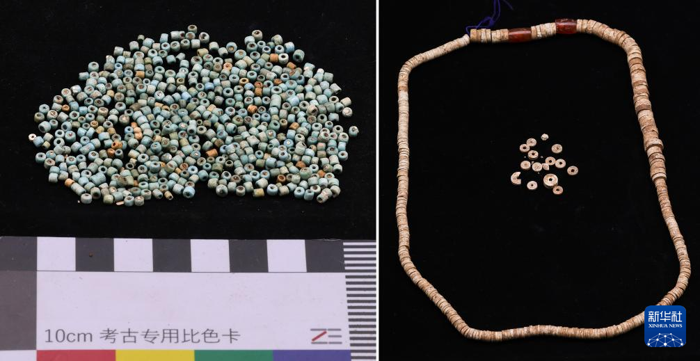 ?這是瑪不錯遺址出土的費(fèi)昂斯珠(左)和帶有紅玉髓的滑石珠串(拼版照片)。新華社發(fā)(西藏自治區(qū)文物保護(hù)研究所供圖)