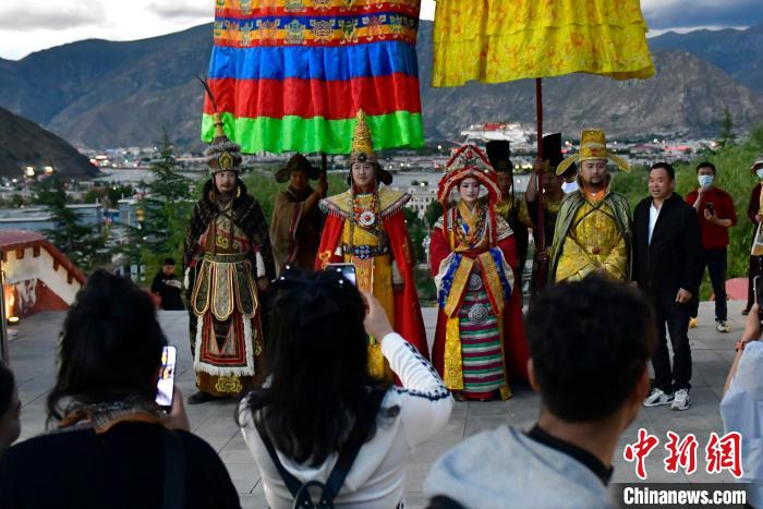 圖為《文成公主》大型實景劇演員在文成公主藏文化風(fēng)情園巡游,與游客互動。李林 攝