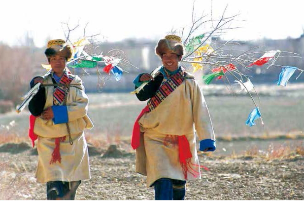 藏歷正月初三,又是一個(gè)激動(dòng)人心的日子,這一天清早起來,家家戶戶到屋頂“煨桑”。煨為漢語,是燃燒不見火焰的意思,“桑”是藏語,是冒煙的意思,有人譯成“燒煙煙”、“燒神煙”,主要是煨燒香草和松枝柏葉升起裊裊香煙,驅(qū)除人間的污濁和瘟疫,祭祀鄉(xiāng)士神靈和護(hù)法神靈。接著,拔除屋頂去年插的經(jīng)幡,重新插上新的經(jīng)幡。經(jīng)幡是五種顏色的印滿經(jīng)文的布,固定在長長的柳樹枝上。據(jù)說紅色象征火焰,黃色象征土地,藍(lán)色象征天空,白色象征云彩,綠色象征江河。還有一種說法,五種顏色分別代表金、木、水、火、土五行。煨桑插旗后,人們一邊揚(yáng)撒糌粑,一邊高喊:“吉吉!索索!拉結(jié)羅!”(意思是供祭啊,供祭啊,神勝利了!)拉薩古城的房子都是平頂?shù)?,房舍屋宇緊緊相連。這一天成百上千的人,都站在屋頂上揚(yáng)撒糌粑,更換彩幡。糌粑粉如大雪紛飛,彩幡如鮮花怒放,祭神的呼聲此起彼伏,整個(gè)拉薩古城都成了神圣的祭壇,到處彌漫著熱烈的氣氛。