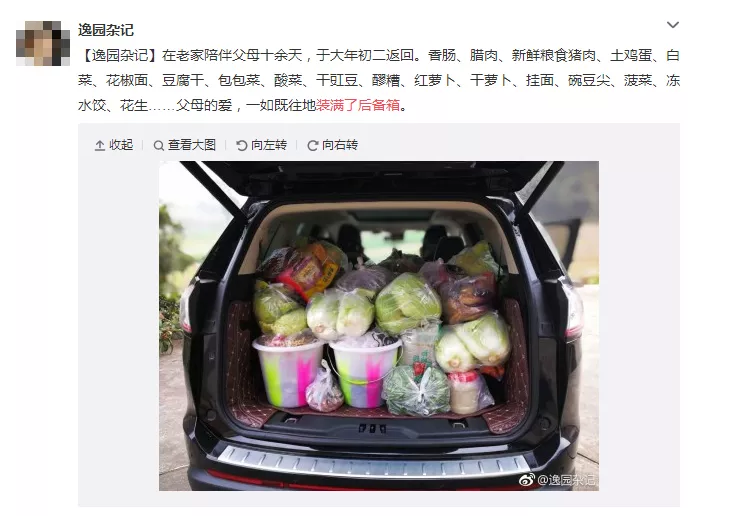 昨日,游子們從家這個(gè)港灣里,鳴笛啟航,奔向遠(yuǎn)方。除了對(duì)鄉(xiāng)愁的百轉(zhuǎn)千回,更有親情的濃郁化不開(kāi)。這幾天,網(wǎng)友們都在微博里曬圖,“媽媽給裝的后備箱”的話(huà)題,一時(shí)成了熱點(diǎn)——“親手做的馬蹄糕”“最?lèi)?ài)的家鄉(xiāng)小柚柑”“一大罐子土榨花生油”“秋天腌的糖蒜”……后備箱被爸媽塞得滿(mǎn)滿(mǎn)的,不愿帶還不高興。于是乎,調(diào)皮的網(wǎng)友留言:“明年我開(kāi)個(gè)貨車(chē)回來(lái)過(guò)年!”