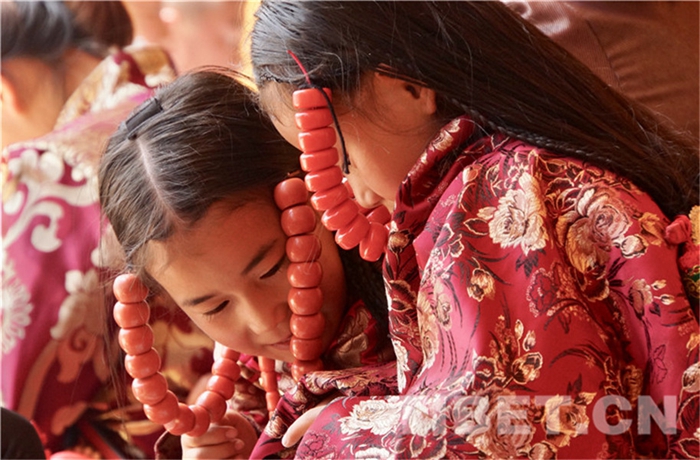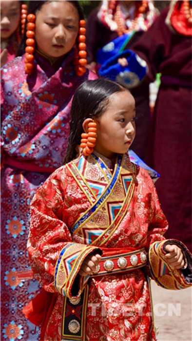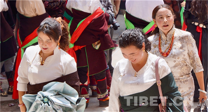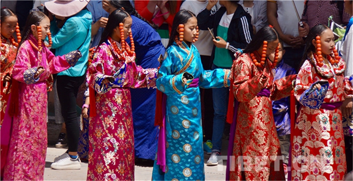 六月會期間有多場舞蹈表演,參與者是年輕的未婚女子,她們穿上最隆重的藏袍,綴上珊瑚蜜蠟松石銀飾,精施粉黛,莊重優(yōu)雅地舉手抬步緩行。舞蹈的動作簡單緩慢,但是女孩子們個個奪目。