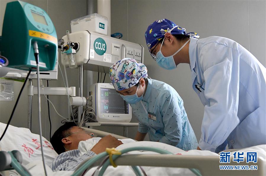 劉光耀(右一)和喬冰(右二)在河南省直第三人民醫(yī)院急重癥醫(yī)學(xué)中心病房內(nèi)詢問病人情況(4月26日攝)。劉光耀和喬冰是河南省直第三人民醫(yī)院急重癥醫(yī)學(xué)中心的護士,也是一對“90后”情侶。新冠肺炎疫情發(fā)生后,他們一起報名申請到武漢一線支援。新華社記者李安攝