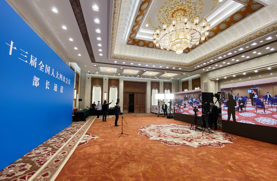 3月5日,十三屆全國(guó)人大四次會(huì)議開(kāi)幕會(huì)結(jié)束后,舉行首場(chǎng)“部長(zhǎng)通道”采訪活動(dòng),邀請(qǐng)部分列席會(huì)議的國(guó)務(wù)院有關(guān)部委負(fù)責(zé)人通過(guò)網(wǎng)絡(luò)視頻方式接受采訪。圖為“部長(zhǎng)通道”現(xiàn)場(chǎng)。新華網(wǎng) 王翰林 攝
