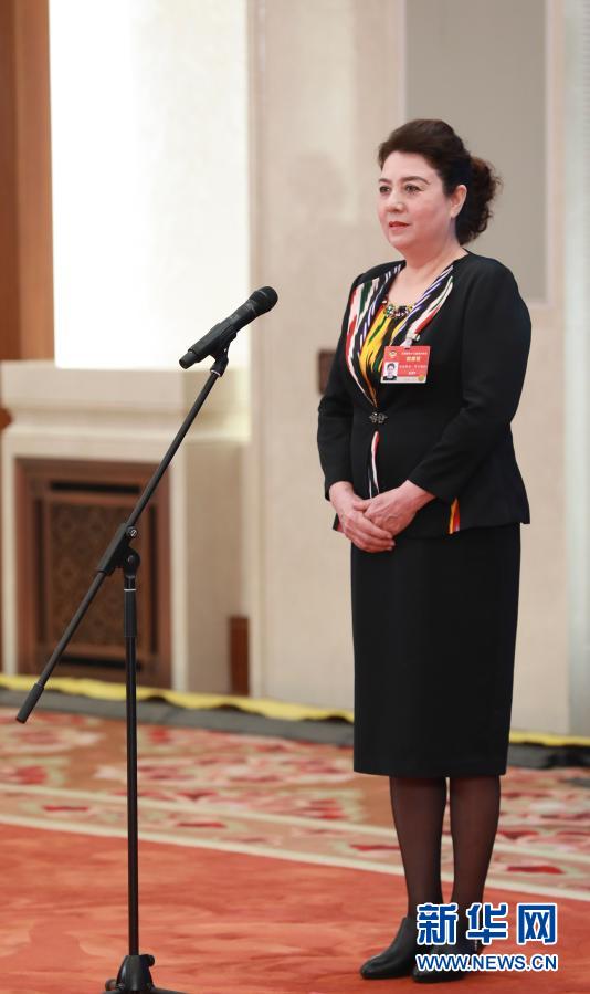 3月10日,全國(guó)政協(xié)十三屆四次會(huì)議第三場(chǎng)“委員通道”采訪活動(dòng)在北京人民大會(huì)堂新聞發(fā)布廳舉行。這是全國(guó)政協(xié)委員古麗帕麗·阿不都拉通過(guò)網(wǎng)絡(luò)視頻方式接受媒體采訪。新華社記者 王南 攝