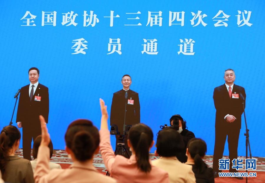 3月10日,全國(guó)政協(xié)十三屆四次會(huì)議在北京人民大會(huì)堂新聞發(fā)布廳舉行第三場(chǎng)“委員通道”采訪活動(dòng)。這是記者(屏幕中手持話筒者)通過網(wǎng)絡(luò)視頻方式提問。新華社記者 王南 攝