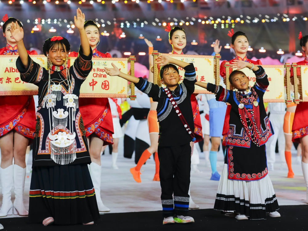7月28日,來自四川涼山彝族自治州的孩子們在成都大運(yùn)會開幕式上歌唱。新華社記者 江宏景 攝