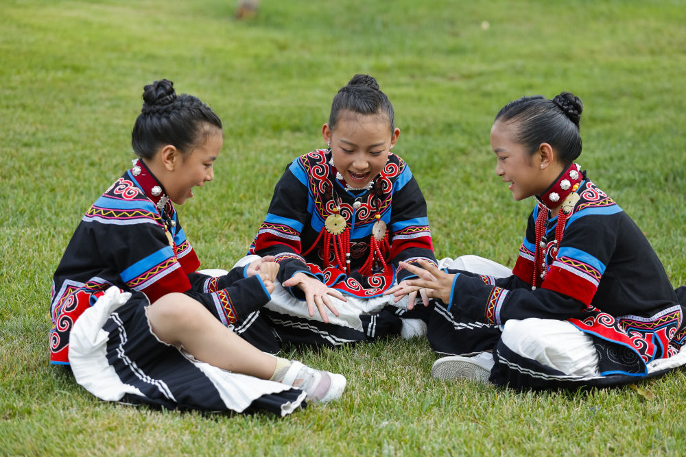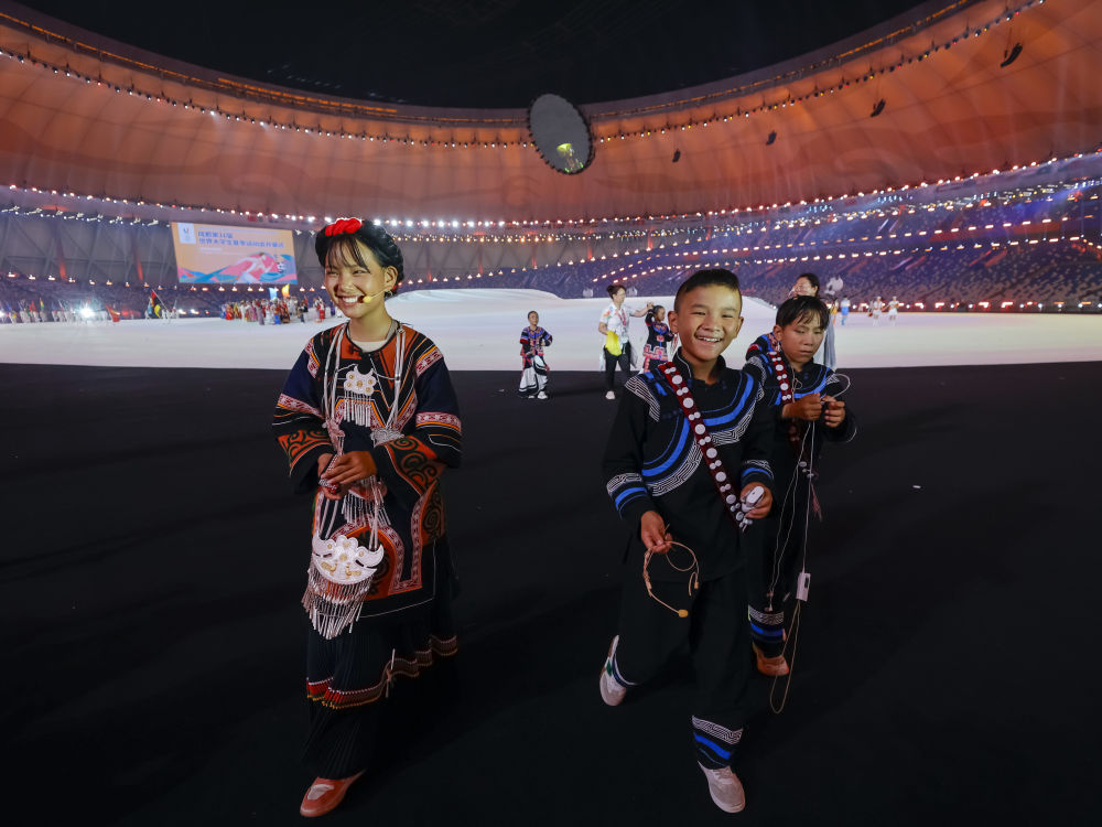 7月23日,成都大運(yùn)會開幕式彩排結(jié)束后,一些演員主動和來自大涼山的孩子們拍攝合影。新華社記者 沈伯韓 攝