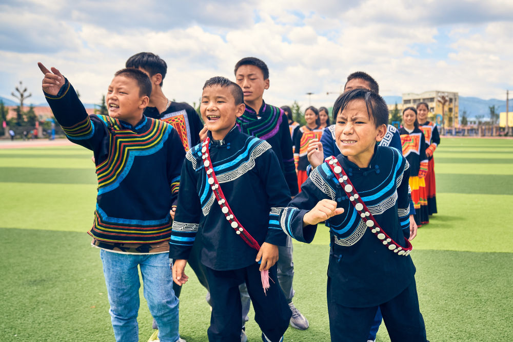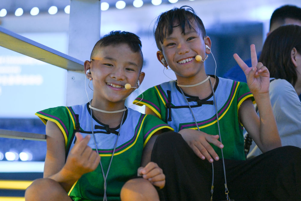 7月23日,在成都大運(yùn)會開幕式彩排結(jié)束后,吉好有果(前左)與其他孩子準(zhǔn)備離開彩排現(xiàn)場。新華社記者沈伯韓 攝