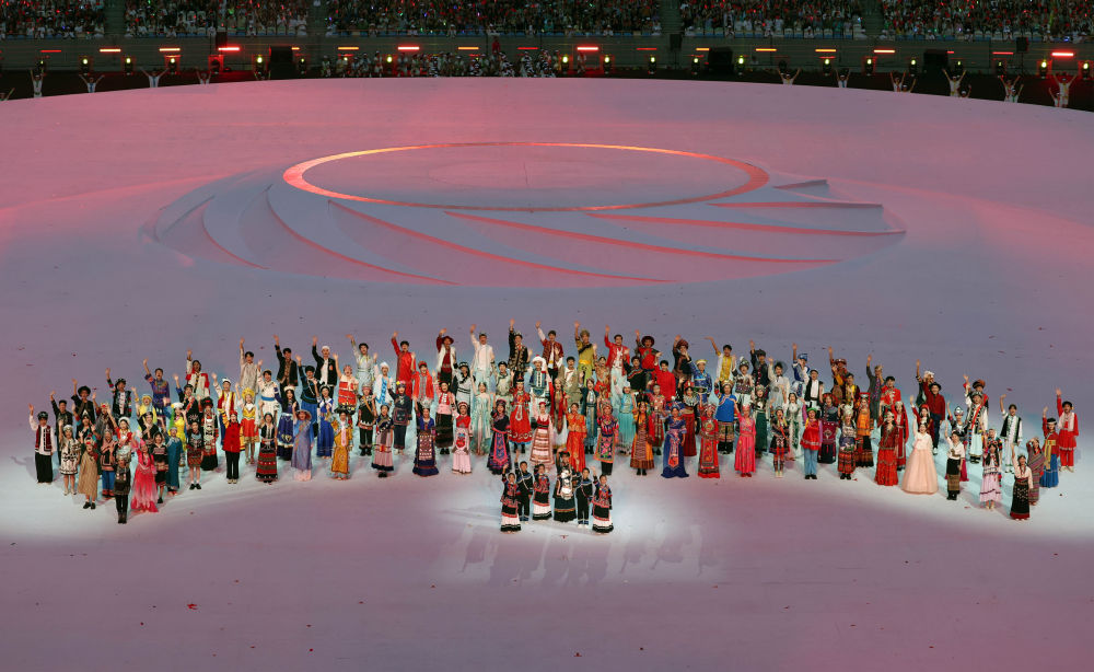 7月28日,來自四川涼山彝族自治州的吉子醫(yī)生、俄地惹漢、馬杰英、吉合拉作、吉朵史拉(前排從左至右)和吉好有果(中)在成都大運(yùn)會開幕式上歌唱。新華社記者 吳剛 攝