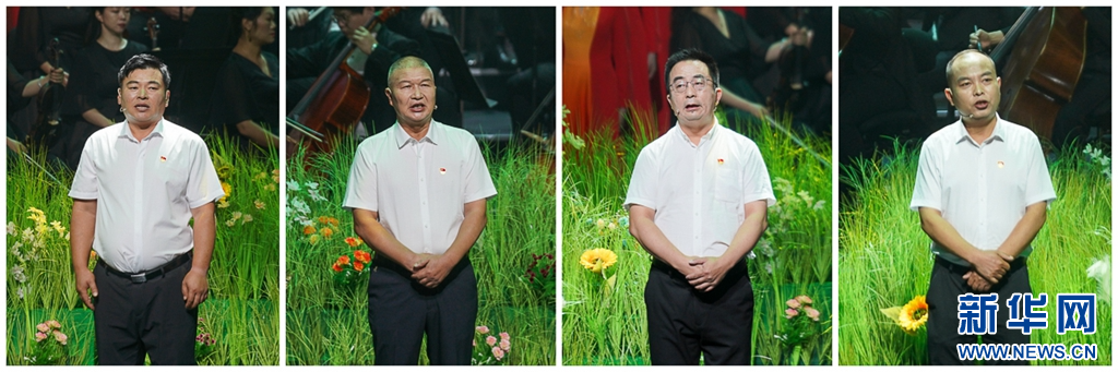 7月17日晚上,來自基層的村干部鞏保雄(左一)、高泉偉(左二)、俞小平(右二)和施金通(右一)走上舞臺(tái),深情講述《新時(shí)代——我做鄉(xiāng)村振興答卷人》。新華網(wǎng) 肖和勇 攝