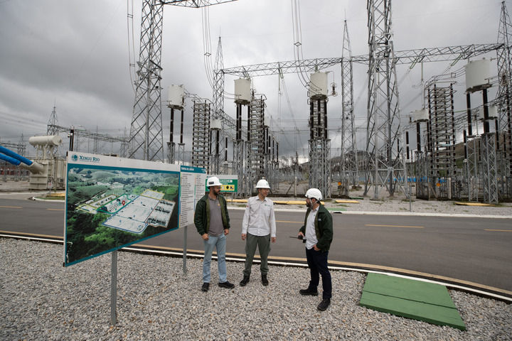 2022年9月30日,在巴西里約熱內盧美麗山特高壓輸電二期項目里約換流站,國網(wǎng)巴控公司換流站運維主管(中)和巴方人員交談。新華社記者 王天聰 攝